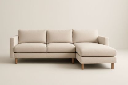 Divano angolare in tessuto poliestere beige con struttura in legno massello