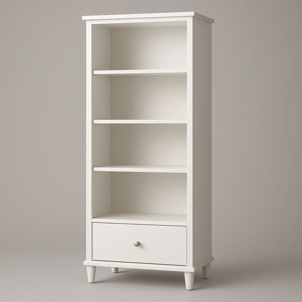 Libreria MDF bianco con quattro ripiani e un cassetto